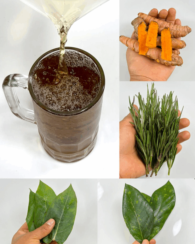 1️⃣ Coloca en una olla las hojas de aguacate, cúrcuma, hojas de eucalipto y el romero.
