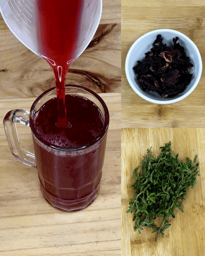 1️⃣ Coloca las hojas de orégano poleo y la flor de Jamaica en una cacerola