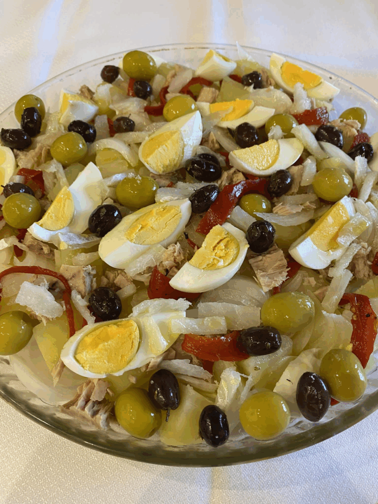 Pelamos las patatas que ya tenemos cocidas y las cortamos en trozos. Las ponemos en una fuente que vayamos a hacer la ensalada. Seguidamente, añadimos la cebolla cortada muy finita estilo Juliana. Luego, añadimos el pimiento a tirita fina añadimos las dos latas de atún, pelamos y cortamos los huevos y los ponemos alrededor. Partimos el bacalao a trocitos o en tiras y lo vamos colocando y por último, añadimos las aceitunas verdes y negras