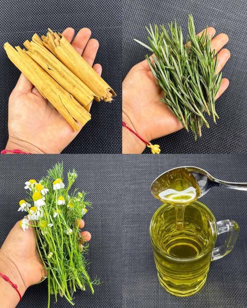 1. Coloca la manzanilla, el romero y la canela en una cacerola.
