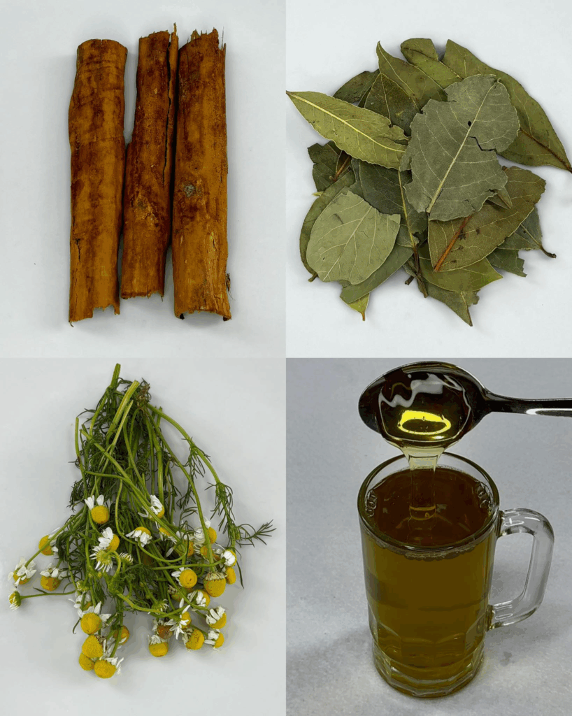 1️⃣ Coloca el laurel, la manzanilla y la canela en una cacerola